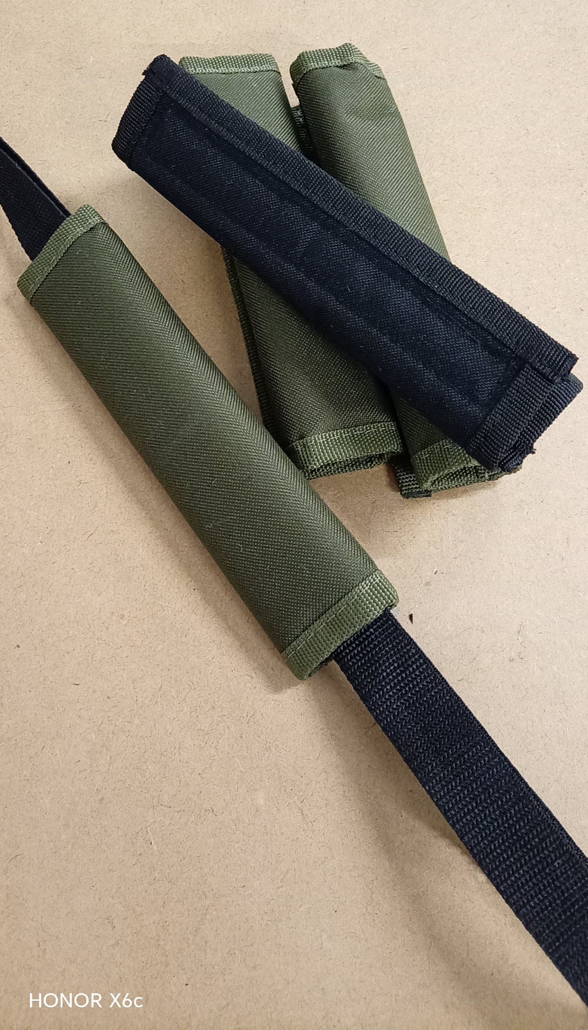 Pictures show individual hand grips in black and olive. Also both a DPM and Competition Blue Bait Bundle Bags with the Midwater Padded Hand Grips holding the carry handles together for convenient more comfortable transport.